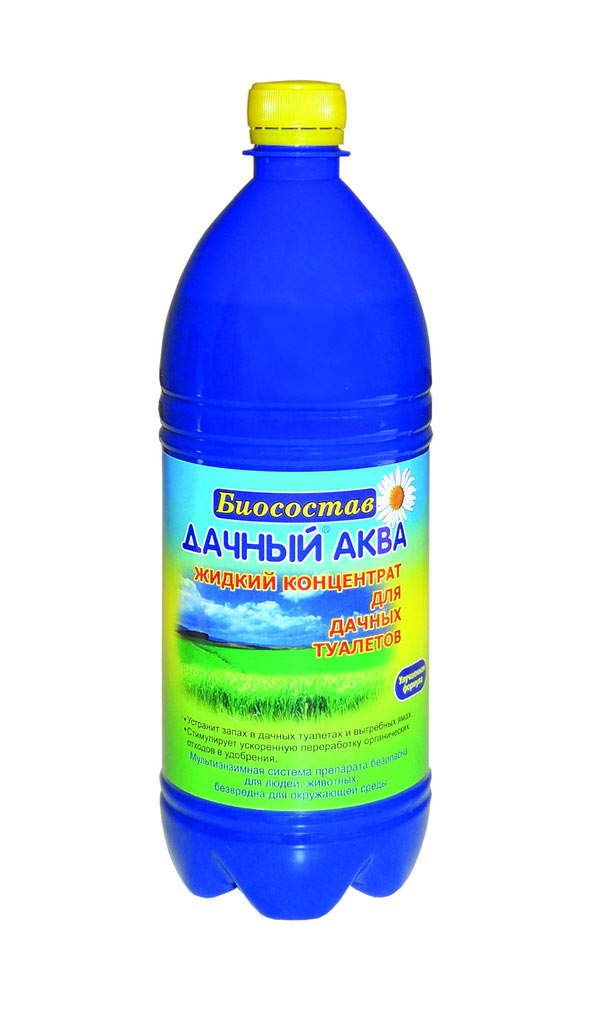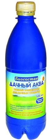 Дачный-Аква Биосостав предназначен для дачных туалетов и выгребных ям. Разлагает отходы жизнедеятельности человека. По действию и получаемому результату аналогичен сухому биосоставу «Дачный 100г», однако имеет ряд преимуществ. Во-первых, ферменты в нем находятся в жидком растворе, что обеспечивает более высокую скорость их действия и легкость разведения состава. Во-вторых, содержит отдушку и краситель, которые маскируют запах в первые несколько суток, пока ферменты только начинают действовать, т.е. биосостав действует практически мгновенно. После применения образовавшуюся в яме субстанцию также можно использовать как удобрение. Краситель и отдушка используются пищевые: безвредны для растений.