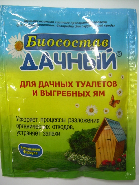 Биосостав «Дачный» применяется для дачных туалетов и выгребных ям. Предназначен для разложения продуктов жизнедеятельности человека. В результате работы входящих в его состав ферментов, содержимое выгребных ям полностью перерабатывается в удобрение, которое можно использовать для подкормки деревьев и кустарников. Полностью пропадает запах и сопутствующие ему мухи и другие насекомые. Вместе с этим биосостав экологически абсолютно безопасен, не содержит химии и лишь многократно ускоряет происходящие в природе процессы.